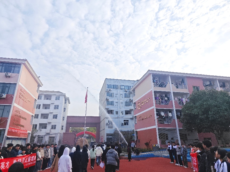 校门口,水炮喷涌而出,在空中交汇成一道壮观的拱形水门。同学们以两列纵队,步伐坚定地小跑穿过水门。水幕倾泻而下,寓意“接受洗礼,迎难而上”。这不仅是一场视觉的盛宴,更是学校对学子们“鱼跃龙门”的美好祝愿。带着满身朝气与祝福,同学们有序上车。班主任逐一确认点名,确保万无一失。