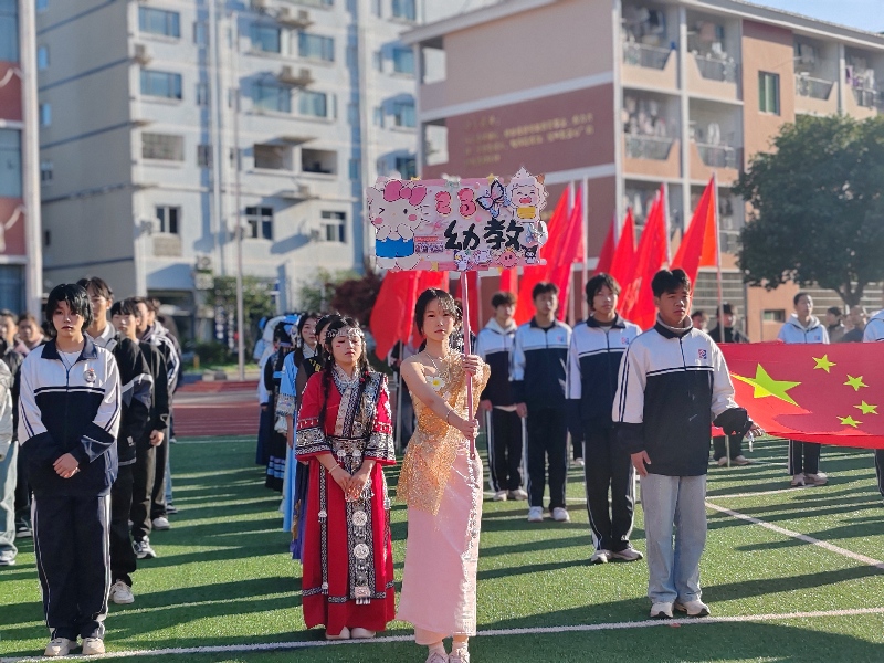 最后入场的是裁判员方阵,老师们一个个精神饱满,展现了公平公正、严肃认真的职业素养,成为赛场上一道亮丽的风景线。在雄壮的国歌声中,鲜艳的五星红旗冉冉升起,全场师生齐声高唱国歌,肃立行注目礼,浓厚的爱国情怀在每个人心中激荡。吴淑华校长在开幕辞中强调了体育对学校育人及事业发展的重要意义。吴校长指出,学校积极贯彻国家全民体育运动的号召,不断丰富体育活动,提高体育教学质量。她希望全体运动员弘扬体育精神,严格遵守比赛规则,奋勇争先,赛出风格、赛出水平。裁判员代表黄婷老师率先宣誓。他们承诺将秉持公平、公正、公开原则,认真履行裁判职责,确保比赛顺利进行。运动员代表向宇(24美容美妆班)随后宣誓,承诺将严格遵守比赛规则,尊重对手,尊重裁判,以最佳状态投入赛事,发扬“友谊第一,比赛第二”的体育精神,展现振邦学子的良好风貌。铿锵有力的誓言回荡在运动场上空,展现了裁判员和运动员对体育精神的共同坚守。在热烈的掌声中,韩长青副校长庄严宣布:“九江市振邦技工学校2025第五届秋季运动会正式开幕!”这一刻,彩旗舞动,掌声雷动,整个运动场变成了欢乐的海洋。热烈的气氛点燃了全场师生的激情,也宣告着本届运动会各项赛事正式拉开帷幕。开幕式上,精彩节目轮番上演,赢得阵阵喝彩。特别值得一提的是,24级汽修专业学子带来的汽车拆装表演,展现出扎实的专业技能,将现场气氛推向高潮。
