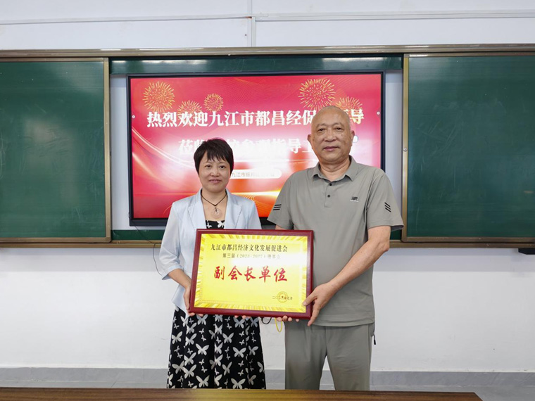 座谈尾声,现场举行了简洁而庄重的授牌仪式。九江市都昌经促会会长黄金如,代表经促会为九江市振邦技工学校校长吴淑华,授予九江市都昌经济文化发展促进会第三届副会长单位荣誉牌匾。这份荣誉是对我校在职业教育领域贡献的肯定,也标志着学校与经促会携手共促地方发展的新起点。