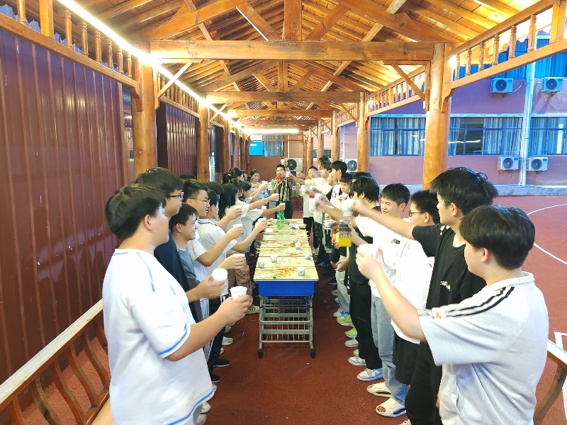 凉亭旁炭火跳跃,香气四溢。平日里传道授业的班主任,此刻化身“烧烤大师”,专注地翻动着滋滋作响的肉串。同学们围在一旁,有的帮忙递送调料,有的跃跃欲试想露一手。一串串美食传递着轻松与关怀,一句句闲谈拉近了彼此距离。清脆的碰杯声叮当作响,笑容在分享美食的瞬间绽放,轻松的氛围拉近了心与心的距离。当烟火气渐渐融入夜色,凉亭瞬间变身活力KTV!同学们热情高涨,纷纷点歌献唱。悠扬的旋律、动感的节奏,青春的歌声在夏夜晚风中自由飘荡。更有暖心的画面悄然定格:女生们围坐在操场中央的草坪上,月光下,或轻声细语分享心事,或投入地玩着小游戏,清脆的笑声在夜风中飘荡。