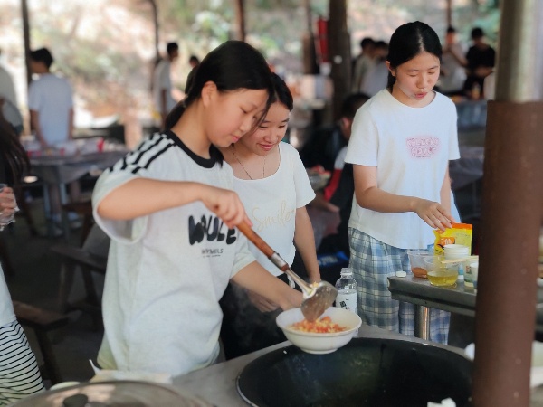 在班主任的带领和全程陪伴下,一场融合自然体验与劳动协作的欢乐时光正式开启。农家灶台区早已准备就绪,同学们分组协作,纷纷主动认领任务:洗菜、切菜、拾柴、生火……虽然动作略显生疏,但热情丝毫不减。班主任一边张罗调度,一边亲手示范,还不时为大家切上清甜的西瓜解暑。从西红柿炒蛋到青椒炒肉,从洗米煮饭到整理餐具,同学们在协作中逐渐熟悉彼此,也体会到一餐一饭背后所需付出的努力。灶火映照着青春的面庞,也点燃了团队合作的信心。