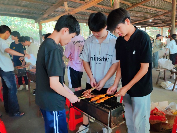 另一侧的烧烤区同样热闹非凡。炭火生起后,同学们轮流上阵,展示“厨艺”:有的负责翻转食材,有的忙着刷油撒料,有的主动分发烤好的食物。不时因火候掌握不熟练而引来一阵欢笑,也因某位同学烤出的“完美鸡翅”而收获一片赞叹。班主任穿梭于各组之间,协助生火、递送食材,偶尔也客串“品鉴官”。炊烟袅袅中,忙碌的身影、互相分享的画面、不经意间的调侃,都成为这次活动中最生动的记忆碎片。短短一上午,从略显拘谨到彼此熟络,从单打独斗到默契配合,同学们不仅在农家灶台和烧烤架前收获了美食与欢笑,更在协作中深化了对“团队”的理解。