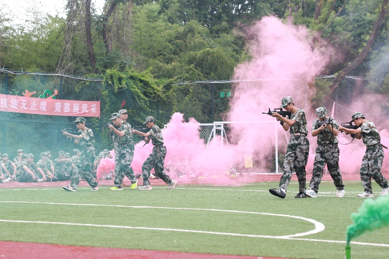 "一、二、三、四!"伴随着响亮的口号声,各军训连队依次进行会操表演。同学们步伐坚定、动作整齐、气势如虹,展示了立正、稍息、停止间转法等基本军事动作,每一个动作都干净利落,每一声口号都响彻云霄。军体拳表演虎虎生风,战术演练紧张逼真,展现出振邦学子昂扬向上的精神风貌。特别是一段精彩的手语操表演,用无声的语言表达了感恩与坚守,体现了团队协作精神和严明的纪律性,赢得了全场阵阵掌声。